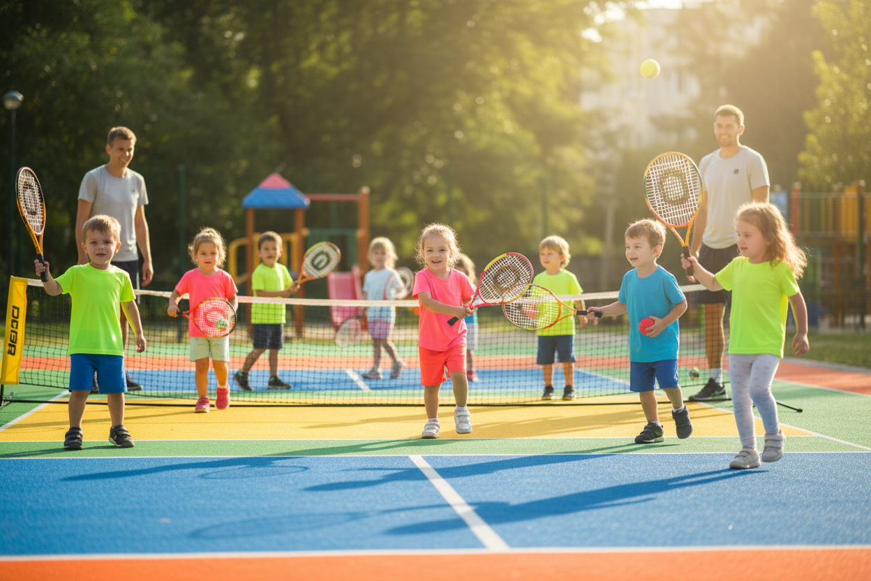 Our junior curriculum is built from the ground up. Mini Tennis for ages 4–6 uses low-compression balls on shorter courts. No child is placed above their level.